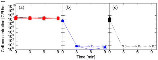 PEF treatment is a non-thermal bactericidal method that can minimize the loss of taste, aroma, color, and nutrients in food [111,112]. The inactivation of the microorganism is achieved by the electrical breakdown of the cell membranes during exposure to electric fields. The lethal effect of PEF treatment is dependent on the electric field strength and the treatment time [113]. When the cell suspensions of each microorganism were treated with PEF at the electric field strength of 15 kV/cm for 1 min, the viable cell densities of Exiguobacterium sp. and Pantoea sp. decreased by about 5 log and 4 log CFU/mL, respectively (Figure 10a,b). In contrast, no bactericidal effect against E. coli was observed (Figure 10c). Since the temperatures of these cell suspensions reached the lethal level of the respective microorganisms (approximately 50 °C), it is necessary to think about the effect of heat on the bactericidal effect. In the heat treatment experiment, about 1 log and 2 log reductions in CFU/mL for Exiguobacterium sp. and Pantoea sp., respectively, were observed at 50 °C for 5 min (Figure 3a,b). If the treatment is completed within 1 min, the decrease in the number of viable cells is estimated to be more suppressed. Therefore, the bactericidal effect against each microorganism observed here is not considered to be due only to the generated heat. The possibility of the combined effects of heat and PEF treatment on the bactericidal effect [111,114] should be considered. Exiguobacterium sp. and Pantoea sp. were inactivated by PEF treatment that did not cause lethal damage to E. coli. As we discussed in the previous work [111], the sensitivity of microorganisms to PEF treatment is considered to be dependent on the difference in the stability of cell membranes. Since Exiguobacterium sp. and Pantoea sp. were cultured at 4 °C, their cell membranes should become fragile due to the relatively high content of unsaturated fatty acid in phospholipid molecules. Thus, they become more sensitive to PEF treatment. The results obtained here show good agreement with our previous work and support our hypothesis that the bactericidal effect of PEF treatment depends on the culture temperature of the objective microorganism [111]. Because PEF would primarily attack the cell membrane, this method may also be applicable to the inactivation of other cold-tolerant microorganisms.