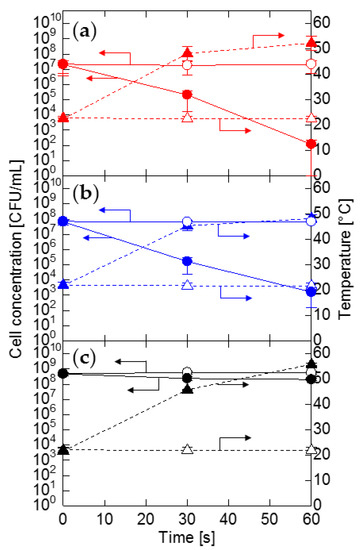 Effect of PEF treatment on Exiguobacterium sp. (a), Pantoea sp. (b), and E. coli (c). Symbols indicate cell concentration of PEF treated sample (closed circles), temperature of PEF treated sample (closed triangles), cell concentration of sample without PEF treatment (open circles), and temperature of sample without PEF treatment (open triangles).