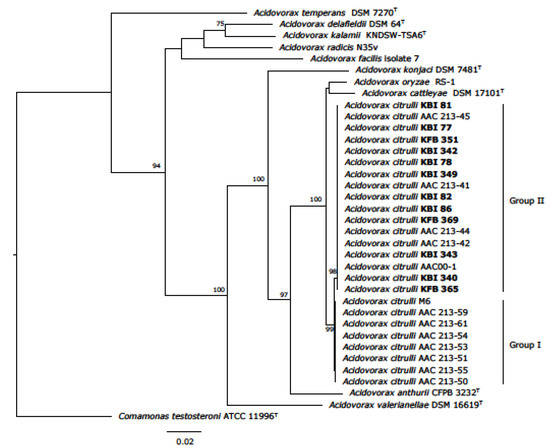 Maximum likelihood tree based on concatenated housekeeping genes adk, pilT, gyrB and gltA (2404 bp) sequences. The tree indicates the phylogenetic position of 12 representative A. citrulli strains (marked in bold). Comamonas testosteroni (strain ATCC 11996T) was used as the outgroup organism. General time-reversible model with rate heterogeneity across Gamma model (GTR + G4 + F) was applied for tree construction. Ultrafast bootstrap support values (>70) are indicated at the nodes. Classification of strains into group I and II is shown on the phylogenetic tree.