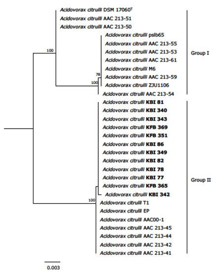 - Zivanovic, M.; Walcott, R. Further characterization of genetically distinct groups of Acidovorax citrulli strains. Phytopathology 2017, 107, 29–35. [Google Scholar] [CrossRef] [PubMed] [Green Version]