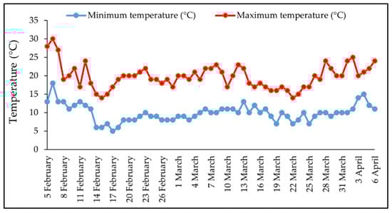 The investigation was accomplished during the 2021 winter-spring period at the field facilities of the Department of Agricultural, Food and Forestry Sciences of the University of Palermo (SAAF), Palermo (latitude 38°12′ N, longitude 13°36′ E, altitude 65 m), located in a sub-urban area. Plants under investigation were grown in a polyethylene-covered tunnel. The tunnel was equipped with a drip irrigation system for water and nutrients distribution. A data logger was placed inside the tunnel to record microclimate data (daily maximum and minimum temperature) (Figure 1).