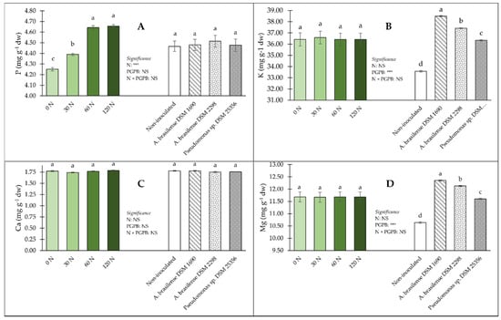 ANOVA for P, K, Ca and Mg did not reveal a significant effect of the interaction N × PGPB (Figure 3).