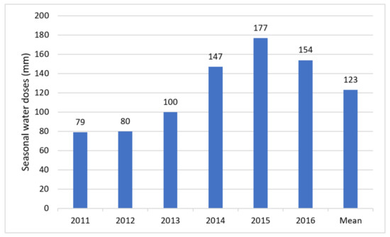 Seasonal water doses (mm) for asparagus plants in the years 2011–2016.