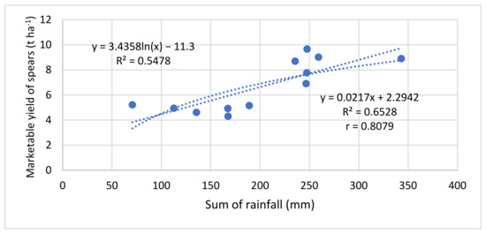 Relationships between the sum of rainfall and irrigation rates in July–August and marketable yield of green spears of ‘Rapsody’.