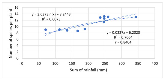 Relationships between the sum of rainfall and irrigation rates in July–August and number of spears per plant of ‘Ravel’.