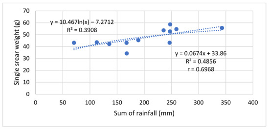 Relationship between sum of rainfall and irrigation rates in July–August and single-spear weight of ‘Ramada’.