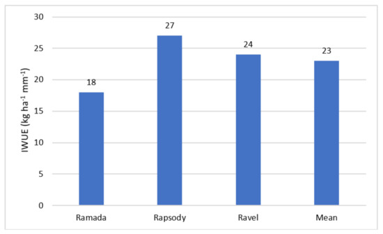 Irrigation water use efficiency (IWUE), through the drip fertigation system, on average for the three tested cultivars and six years of harvest, was 23 kg ha−1 mm−1 (Figure 5). Among the tested cultivars, the highest IWUE was noted in the case of ‘Rapsody’ (27 kg ha−1 mm−1) and the lowest for ‘Ramada’ (18 kg ha−1 mm−1).