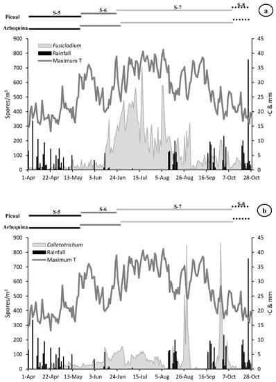 Dinamycs of the Fusicladium (a), Colletotrichum (b) and Pseudocercospora (c) aerobiological fungal spores (grey area) and daily meteorological parameters (maximum temperature in lines and rainfall in bars). On the top, length of the main phenological stages for Arbequina and Picual varieties (S5-Stage 5: Inflorescence emergence, S6-Stage 6: Flowering, S7-Stage 7: Fruit development and S8-Stage 8: Maturity of fruit).