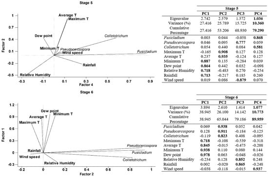 Principal Component Analysis on each phenological stage, Stage 5: Inflorescence emergence; Stage 6: Flowering; Stage 7: Fruit development and Stage 8: Maturity of fruit for three studied fungus and the main weather variables. (PC1) Principal component one, (PC2) Principal component two, (PC3) Principal component three and (PC4) Principal component four. In bold the highest weights in each principal component.