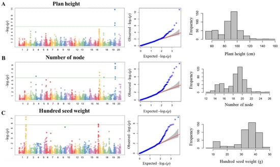 Manhattan plots, quantile-quantile (QQ) plot of MLM analysis and phenotypic distribution for plant height (A), number of node (B), and hundred seed weight (C). The horizontal green line indicates the genome-wide significance threshold (Bonferroni correction < 0.05).