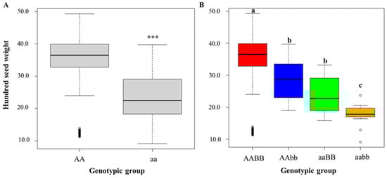 Box plots of hundred-seed weight with BLG accessions. (A) Boxplot of two genotypic groups based on the most significant SNP on chromosome 2. (B) Boxplot of four genotypic groups showing the interaction of two SNPs on chromosome 2 and 16. Genotype “A” was represented as adenine base of Gm02_8896955, where “a” is guanin base of Gm02_8896955. Genotype “B” indicates the adenine base of Gm16_31822897 and “b” shows the guanine base of Gm16_31822897. Statistical analysis was conducted using the Student’s t-test (*** p < 0.001). Bars indicate standard deviation. LSD is the least square difference between genotypic classes in hundred-seed weight and different letters on bars are different at a 5% level of significance.