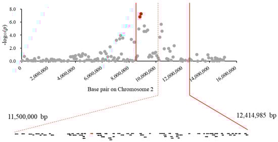 Linkage disequilibrium block of most significant SNPs on chromosome 2 in BLG accessions. The location in linkage disequilibrium (LD) block on chromosome 2 were shown by red solid lines. A total of 255 genes is in LD between two solid lines. The encoded genes are shown as arrows in the part of LD block between a dotted line (11,500,000 bp) and a solid line (12,414,985 bp). Glyma.02G119600 encoded CYP78A57 is indicated by the red arrow. Each pot represents the SNP. Red dots are the most significant SNPs for hundred seed weight.