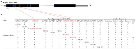 The amount of re-sequencing data on soybean has risen to be publicly available over the last decade [,,,]. Online tools and databases have been developed with genome sequencing data. In this study, the soybean allele catalog, an online tool, was used to identify the allelic variation of GmCYP78A57 through SoyKB [], revealing 11 missense mutations and one deletion in exons (Figure 4). Of these, 10 variants of GmCYP78A57 were shown in wild soybean accessions. We supported that wild soybean accessions showed a wide range of allelic variations.