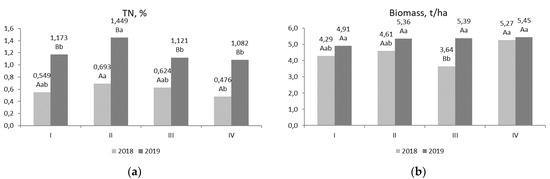The results of ANOVA for: (a) MxG leaf nitrogen content; (b) above-ground biomass, with soil treatments and vegetation years as factors. Different letters represent significant (p < 0.05) differences between treatments (lower-case letters) and vegetation year (upper-case letters). Abbreviations: I-soil without amendment; II-sludge; III-mycorrhizae; IV-MxG ash.