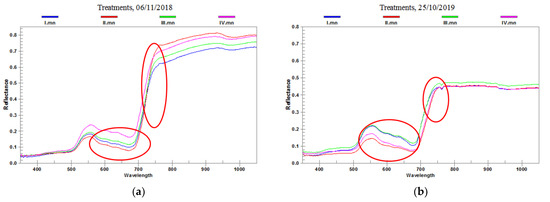Differences in average leaf reflectance according to experiment treatments in vegetation years 2018 (a) and 2019 (b). Abbreviations: I-soil without amendment; II-sludge; III-mycorrhizae; IV-MxG ash.