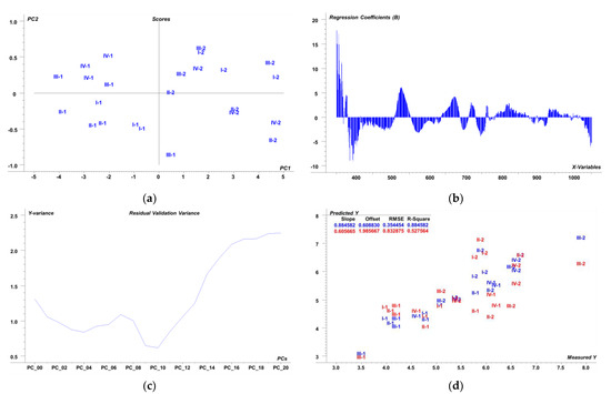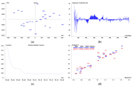 Results of full cross-validation PLSR prediction model for aboveground MxG biomass (t/ha) for cumulative investigation period based on 1st derivative of leaf reflectance (n = 24): (a) PCA score plot; (b) regression coefficient plot; (c) residual validation variance; (d) prediction plot. ● calibration ● validation. Abbreviations: I-soil without amendment; II-sludge; III-mycorrhizae; IV-MxG ash; 1-vegetation year 2018; 2-vegetation year 2019.