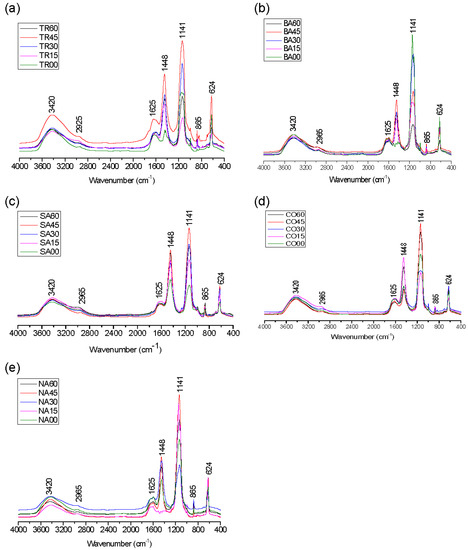 The availability of nutrients to plants is influenced by the amount and type of C in the growing substrate, whereas the humification process is affected by the quality of the C present in the compost [13,40,41]. In this respect, FTIR spectra have been widely used to investigate the changes to structural and functional HA groups associated with composting [42,43,44,45]. Thus, the spectroscopic characterization of the HA fraction extracted from the different experimental composts may provide important information regarding the quality of the organic amendments used in this study for parsley production. FTIR spectra of the HA fraction from composts prepared from poultry wastes and different bulking agents combined with charcoal are shown in Figure 1a–e. The FTIR spectra of HA from all composts showed similar absorption bands that differed only in their relative intensity. The main spectra were identified; the corresponding characteristics are described as follows: (a) an absorption band at approximately 3438 to 3418 cm−1, commonly attributed to the O–H stretching of alcohols, phenols, and organic acids, as well as H-bonded N–H groups; (b) a weak band at approximately 2998 to 2943 cm−1, caused by the C–H stretching of alkyl structures; (c) an absorbance band at approximately 1600 to 1646 cm−1, primarily attributed to aromatic and olefinic C=C and C=O bonds in carboxyl, amide, ketone, and quinone groups; (d) a peak near 1448 cm−1, generally associated with the O–H bond of phenols, COO−, –CH3, and amides; and (e) a sharp band centered at approximately 1141 cm−1, attributed to the C–O stretching of secondary alcohols and/or ethers.