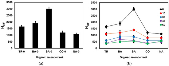 LIF spectroscopy is a promising technique for organic matter studies [39], allowing for rapid analysis of samples without any prior chemical treatment. Furthermore, LIF has been used to assess the degree of humification of organic matter in soil/substrate samples using spectra comparable to electron paramagnetic resonance and nuclear magnetic resonance spectra to estimate the HLIF [16,19]. The HLIF values for TR, BA, SA, CO, and NA composts without the addition of charcoal are shown in Figure 2a.