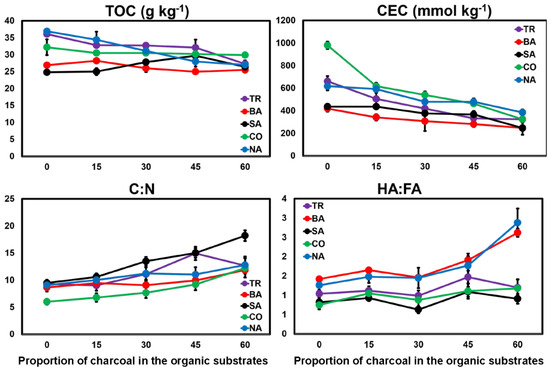 Total organic carbon content (TOC), cation exchange capacity (CEC), C:N and humic acid/fulvic acid (HA/FA) ratios of organic amendments made from mixtures of composts and charcoal. Composts were made from poultry industry wastes and tree trimmings (TR), sugarcane bagasse (BA), sawdust (SA), cotton residues (CO), and Napier grass (NA). The numbers 0, 15, 30, 45, and 60 correspond to the proportion of charcoal in the organic amendment (%, weight basis). Error bars represent standard deviations.