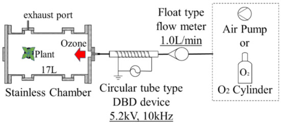The dielectric barrier discharge (DBD) device in cylindrical geometry is used for the plasma irradiation to leaf under atmospheric pressure [17,18,19,20]. Figure 2 illustrates the schematic diagram of a plasma treatment device using the cylindrical-type surface DBD device. A ceramics tube with dimensions of 6 mm in outer diameter, 4 mm in inner diameter, and 100 mm in length is used as a ceramics tube employed as the dielectric for the DBD, and the copper film wounds on the outer surface of the ceramics tube as the grounded electrode. Cylindrical-shaped stainless-steel mesh as the cathode is set inside the ceramics tube touching on the inner wall of the tube. When the high-frequency electrical power of 10 kHz is applied to the mesh electrode, the DBD occurs in the tube. Discharge voltage and current are measured using the high voltage probe and the Rogowski coil with an oscilloscope, respectively. The voltage and frequency applied on the cathode are set at 5.2 kV and 10 kHz, respectively. The electrical power supplied to the discharge is approximately 12 W. Oxygen gas or air flows into the ceramics tube with a flow rate of 1.0 L/min. DBD in the oxygen gas or the air at atmospheric pressure generates plasma, including ozone. Then the ozone generated in the discharge region inside the tube is transported from the discharge region to the treatment chamber, as shown in Figure 2, which is also used for the low-pressure plasma irradiation. In the chamber, the plant is placed and is exposed to the ozone.