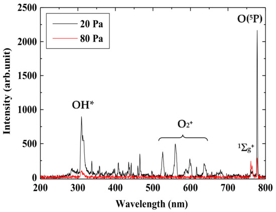 Figure 3 shows typical light emission spectra in the diffused region of low-pressure oxygen plasma with the pressure of 20 and 80 Pa. Exposure time of the spectrometer is 100 ms, and spectra are accumulated 30 times. The slit width of the spectrometer is 25 µm. At the center of the vacuum chamber, where is 110 mm apart from the wounded line type RF antenna set along the inner wall of the vacuum chamber, the light fiber connected to the spectrometer is placed in the axial direction. Significant peaks are observed at 309, 762, and 777 nm in both pressure case, even though the intensity at the pressure of 80 Pa is lower than that of 20 Pa. These peaks correspond to active oxygen species of OH radical, singlet oxygen molecule O2 (1Σg+), and atomic oxygen O(5P) [12,14,30,31], respectively. Moreover, peaks at 527, 559, and 636 nm observed at 20 Pa are attributed to oxygen molecule ions O2+ that require relatively higher electron energy for generation. These peaks cannot be observed at a higher pressure of 80 Pa, where the electron temperature decreases. Figure 4 shows the pressure dependence of light emission intensity from atomic oxygen O(5P) and singlet oxygen molecule O2 (1Σg+). The light emission intensity of O(5P) decreases with oxygen gas pressure, which is due to the decrease of mean electron energy from the discharge by the increase of electron—neutral collisions. The excitation energy of O(5P) from the ground state is around 10.7 eV. The number of energetic electrons decreases with the pressure, and then the amount of atomic oxygen monotonically decreases. Pressure dependences of OH radical, O(3P), O(1S) and O(1D) are almost similar with O(5P). On the other hand, the light emission intensity of singlet oxygen molecule O2 (1Σg+ → 3Σg−) increases with pressure until 60 Pa and then decreases above 60 Pa. The excitation energy of O2 (1Σg+) is relatively lower, 1.63 eV. When the pressure is in the range of 10 to 60 Pa, production of atomic oxygen decreases and production of O2 (1Σg+) increases. Above 60 Pa, electrons lose energy due to an increase in collisions, and the proportion of electrons that do not exceed the oxygen excitation energy increases, and then the production of O2 (1Σg+) decreases.