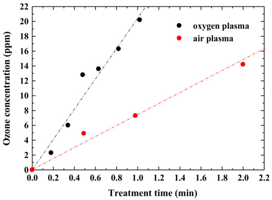Ozone concentration in atmospheric plasmas changing ozone treatment time.
