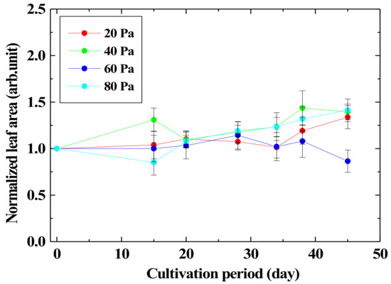 Cultivation period dependency of normalized leaf area by irradiation seeds with the low-pressure oxygen plasma for 3 min at different pressure.