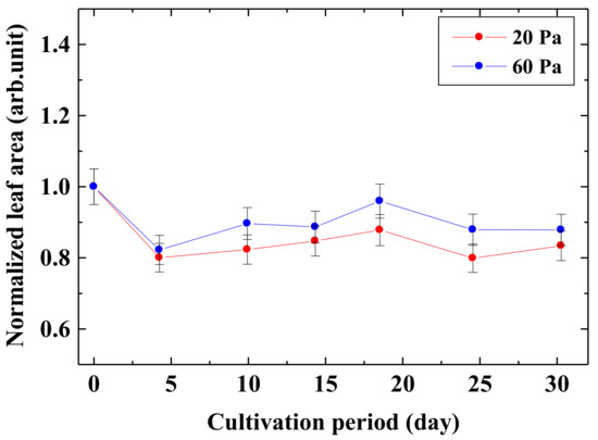Cultivation period dependency of normalized leaf area by irradiation seeds with the low-pressure oxygen plasma for 30 min at different pressure.