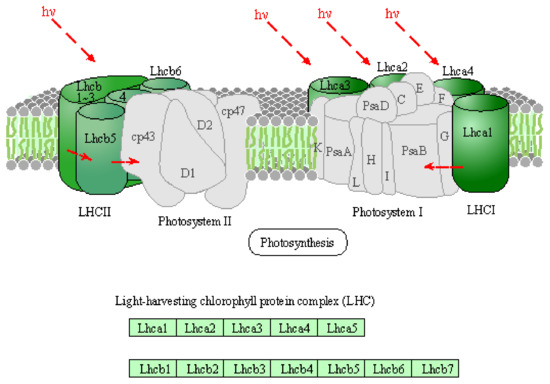- Kyoto Encyclopedia of Genes and Genomes, LHC. Available online: https://www.genome.jp/dbget-bin/get_linkdb?-t+genes+path:ath00196 (accessed on 1 December 2021).