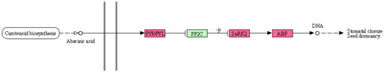 In addition, the gene expression level of the response to abscisic acid (ABA), which is one of the plant hormones, was increased in the KEGG signal pathway, as shown in Figure 10. Acronyms of proteins in the pathway on this figure are PYR/PYL: abscisic acid receptor PYR/PYL family, PP2C: protein phosphatase 2C, SnRK2: serine/threonine-protein kinase SRK2, and ABF: ABA responsive element binding factor. Expression of the response to ABA increases in response to drought stress, and ABA contributes to the efficient use of water by closing the pores and suppressing the evaporation of water [41]. It is speculated that the response to abscisic acid increased the area by storing the water.
