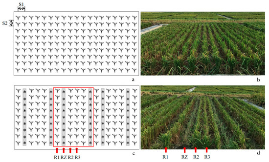 Schematic diagrams (a,c) and field pictures (b,d) of manual harvesting (a,b) and mechanical harvesting (c,d) of the main crop. S1, row space; S2, plant space. The red box represents a harvest unit when the main crop was harvested mechanically. RZ, rolled zone; R1, non-rolled single row; R2, non-rolled side row; R3, non-rolled middle row.