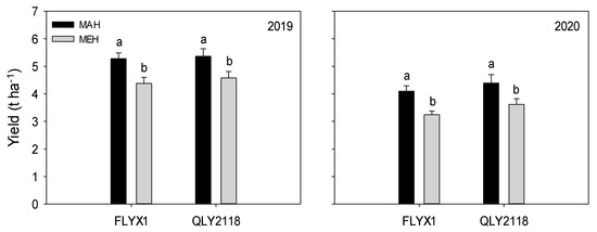 Grain yield of the ratoon crop under manual and mechanical harvesting of the main crop in 2019 and 2020. MAH, manual harvesting; MEH, mechanical harvesting. FLYX1, Fengliangyouxiang1; QLY2118, Quanliangyou2118. Vertical bars represent the standard deviation of the mean (n = 4). For each cultivar of each year, data with different lowercase letters are significantly different at the 0.05 probability level.