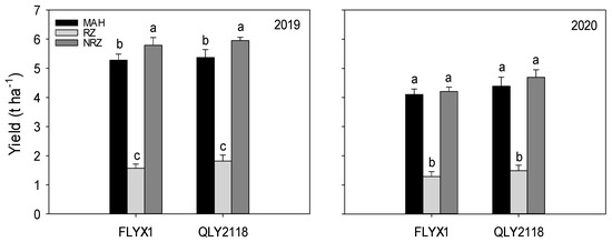 Grain yield of the ratoon crop under manual harvesting of the main crop and the rolled zone and non-rolled zone under mechanical harvesting of the main crop in 2019 and 2020. MAH, manual harvesting; RZ, rolled zone; NRZ, non-rolled zone. FLYX1, Fengliangyouxiang1; and QLY2118, Quanliangyou2118. Vertical bars represent the standard deviation of the mean (n = 4). For each cultivar of each year, data with different lowercase letters are significantly different at the 0.05 probability level.