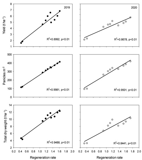 Correlations of the grain yield, panicle m−2, and total dry weight with the regeneration rate in the ratoon crop under two harvest methods of the main crop in 2019 and 2020 (n = 10).