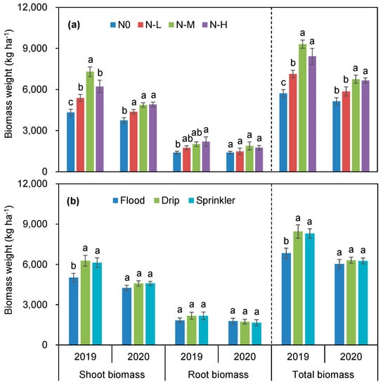 Biomass weight as affected by N application rates (a) and irrigation methods (b) during the two wheat-growing seasons in 2019 and 2020. The different letters above the bar indicate significant differences (p < 0.05) according to the Fisher's LSD test.