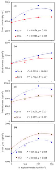 Biomass production responded strongly to N fertilization and irrigation methods in both years (Figure 1, Table 2). Under different N application rates, shoot biomass ranged enormously: from 4318 to 6221 kg ha−1 in 2019, which was greater than that in 2020 (3744 to 4903 kg ha−1). The highest shoot production occurred with 200 kg N ha−1 and 300 kg N ha−1 in 2019 and 2020, respectively. Although both N application and irrigation methods had significant effects on shoot production (except for irrigation methods in 2020), their interaction (N × Ir) was not significant (Table 2). In contrast, root biomass showed no response to either N application (except for 2019) or irrigation methods, but they expressed a remarkable association with their interaction (N × Ir). In general, the shoot, root, and total biomass showed significant quadratic relationships with the N application rate (Figure 2a–c).