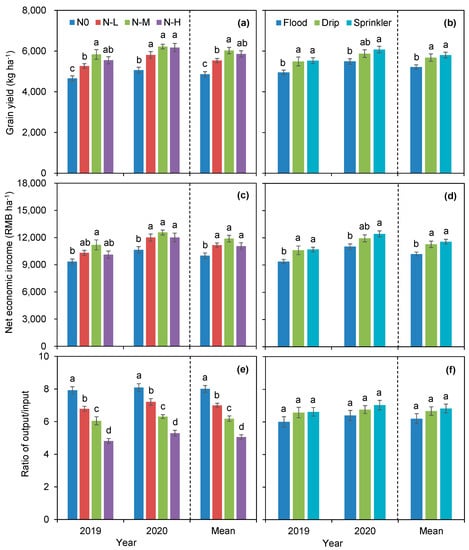 Generally, the ratio of output/input decreased with N application, while it was increased by water-efficient irrigation in both years (Figure 3e,f).