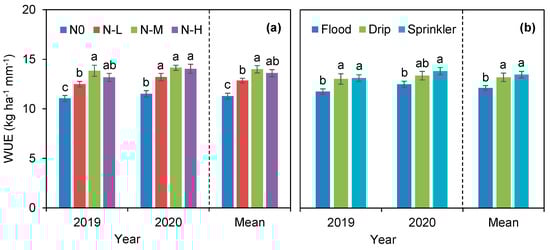 Water-use efficiency (WUE) as affected by N application (a) and irrigation methods (b) in the two wheat-growing seasons in 2019 and 2020. The different letters above the bar indicate significant differences (p < 0.05) according to the Fisher's LSD test.