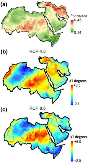 (a) Spatially-explicit trends of the mean annual temperature (MAT) as the slope of the linear regression at p < 0.05 in the MENA (1980 to 2100, n = 121). The lower two figures (b,c) show the absolute difference in MAT in 2100 from the baseline (1980–2000) for the two IPCC scenarios. The climate data used is the statistically downscaled climate data obtained from 3 GCMS under the RICCAR project.