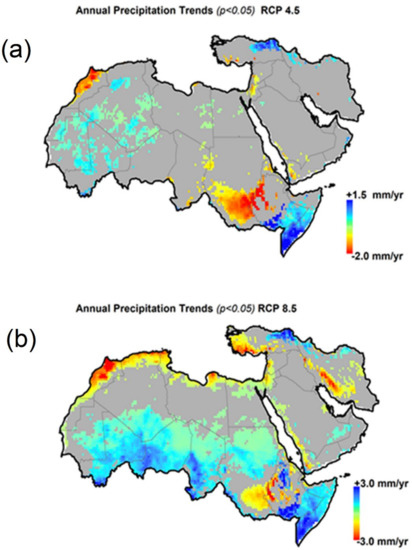 Statistically significant hotspots (slope of the linear regression at p < 0.05) of the mean annual precipitation in the MENA (1980 to 2100, n = 121) for the two IPCC scenarios RCP 4.5 (a) and RCP 8.5 (b). The climate data used is the ensemble of the statistically downscaled climate data obtained from 3 GCMS under the RICCAR project.