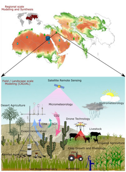 The knowledge of how the climate is changing, what components of the agroecosystem are sensitive to a changing climate and the locations of the hotspots, are open questions in the MENA [22]. The region has not been the focus of the international efforts studying the impact of CC. It is therefore critical to explore the impact of CC at local-to-regional scales, and to identify options of CC adaptation. This warrants the development of a collective intelligence in the future of the region through institutional collaboration, network development, database building and capacity development. There is an urgent need to develop a MENA-scale platform for a network of actors collaborating with different national agencies and other organizations. This platform will accumulate diverse types of ground data to enable multiscale modeling and scenario analysis to decipher the individual and interactive effects of CC in the short and long term. The ground data will span across a wide domain, from hydrometeorology, agrometeorology, agronomy, pests and diseases, livestock, rangeland, demography, socioeconomics, soil processes and ecosystem processes. Such a platform can help to create an invaluable database on how various ecosystems or agroecosystems in the MENA function in terms of hydrometeorology, ecohydrology and biogeochemical process, which have implications on the ecosystem-crop-livestock functioning in a changing climate. Information generated vis this data can be used for international negotiations, capacity building activities and fostering institutional partnerships. The strategy is to adopt the lessons learnt from similar coordinated environmental observatories in the world, such as the CarboEurope, ICOS (Europe) and FluxNet (USA) [23], and to employ such an initiative in the region with an emphasis on agroecosystems, socioeconomics, livestock and rangelands. Still, there is a lack of regional efforts in developing a regional network of monitoring various hydrometeorological, ecohydrological and biogeochemical processes in a coordinated manner. It is necessary to perform continuous observations of these processes (using various methods of measurements and observations) with a consistent protocol of measurement, consistent protocol of data processing and quality control, and consistent protocol of data archiving and dissemination through a centralized database. This database can consist of observational products obtained at several scales, such as: (1) point scale (biometric observations, canopy and soil profile scale observations, such as crop physiology, soil hydrology, soil texture and soil carbon stocks); (2) ecosystem or landscape scale measurements (ecosystem flux measurements using micrometeorological techniques and watershed scale observations, such as runoff and remote sensing-based observations using high spatial resolution sensors) and (3) regional scale data (mostly using decametric and coarser scale remote sensing sensors). One major component of agricultural sustainability in the MENA is water productivity (i.e., the amount of water required to produce a given biomass), for which a proper understanding of evapotranspiration is the key. There is also a need to disseminate modeled spatial datasets pertinent at the regional scale that can be used for progressing scientific research and policy actions. One such data is the spatially-explicit modeled climate and weather data sets at the regional scales. Although many climate datasets are available from many meteorological portals, we still need to bring these data to this centralized MENA platform for operational use. The downscaling of long-term climate scenarios to the farm scale will be used it to run farm-scale biophysical or socioeconomic models and to deduce optimal combinations to adapt to CC. A conceptual figure of this regional network is shown in Figure 3. Such a platform in a precursor study has been recently established by ICARDA and FAO partnering with five national organizations under the regional water scarcity initiative. This network is called the NENA-ET Network, where evapotranspiration and allied agrometeorological observations are conducted under a consistent protocol in five different countries in the MENA [24]. In addition to the biophysical datasets, we also need to accumulate diverse datasets pertaining to socioeconomic elements, market forces and demography in relation to the agri-food system in MENA, as affected by climate and socioeconomic drivers. In this context, a regional effort to monitor and model the issue of migrations and demographic transitions in the MENA region, as a direct and indirect cause of CC, is increasingly becoming relevant in MENA, especially in the rangelands [10]. Livestock population is an inherent component of the MENA’s rangeland agroecosystems and this is tightly linked to crops, climate change and human migrations. Thus, we also need a solid understanding of livestock dynamics in terms of mass migration, grazing behaviors, GHG fluxes and its role in regional resilience in a changing climate. The overall outcome of this regional collective intelligence is the enhanced knowledge about climate vulnerability in various MENA agroecosystems, as perceived from different angles, bolstered with solid ground data. This observed datasets could also serve as calibration and validation datasets while using models for ex ante asessments. This knowledge will be used to address the long-term goals of various countries in the region in the increased livelihoods of the poor population, decreased migrations, decrease in land degradation and enhanced food security. Such a platform should ideally be built on a strong partnership in the region, based on networking, synergistic collaboration, capacity building, infrastructure deployment and the use of multi-scale decision support systems.