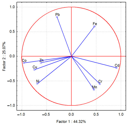 Trace element content in soil calculated with the PCA method. Vectors represent trace elements (content of Cd, Pb, Cr, Co, Ni, Zn, Cu, Mn and Fe).