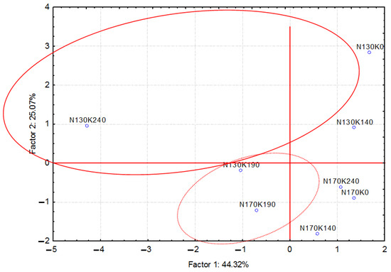Effect of mineral (N and K) fertilization on trace elements content in soil calculated with the PCA method. Points show all trace elements content in soil (N 130—130 mg N kg−1, N 170—170 mg N kg−1; K 0—0 mg K kg−1, K 140—140 mg K kg−1, K 190—190 mg K kg−1, K 240—240 mg kg−1 of soil).