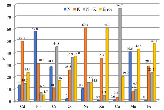 Percent contribution of mineral fertilization according to the content of trace elements in soil: N—nitrogen dose, K—potassium dose, interaction (N · K).