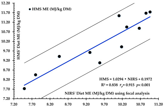 p < 0.05) than the HMS value of 6.88 ± 0.12 (MJ/kg DM). In the winter, the forage quality analyzed from the forage cutting samples and by the HMS were 11.48 ± 0.43 and 10.68 ± 0.36 (MJ/kg DM), respectively, which was not significantly different. In the dry season, the cows received PL (mostly ad libitum) with significant nitrogen content; therefore, it is clear why the HMS ME estimation was significantly greater when cows grazed on dry low-quality forage. The HMS-estimated dietary ME when cows consumed dry forage + PL was similar to that measured in vivo when cows were fed wheat straw and PL under confined conditions [