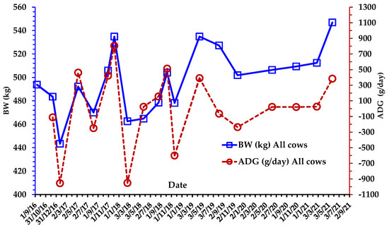 15]) were measured 19 times during the study, i.e., their changes were assessed for 18 periods. Cow weighing and BCS measurements were performed more frequently when changes in forage state (quality and biomass) were greater, and also depended on the herd’s regular treatments and owner availability. As used in regular mange commercial herds, cows in the herd were replaced for reasons of infertility or morbidity. The replaced cows (age, breed body conditions) were similar to the study herd—mature cows, of 4 to 6 calving seasons.