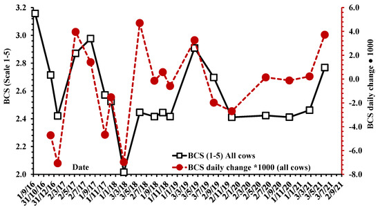 In each period, the ADG (kg/day) according to the changes in BCS was calculated as: (period BCS changes)/(period days) × (84.6 kg) × ((cows’ actual BW in kg)/583 kg). The calculation was based on the NRC [