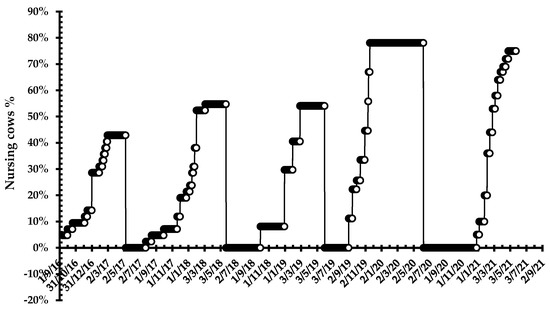 The main economic test of cow-calf operation beef herds is reproductive performance. An intermediate measure is the pregnancy test and the final test of herd economic performance is the weaning percentage. All the cows that were selected for the study (September 2016) were pregnant. The pregnancy rate of the study herd (yearly five years average of 40 cows), that was managed by the HMS, along the other 4 years period, 2017–2018, 2018–2019, 2019–2020, and 2020–2021, were 86%, 72%, 81%, and 81% respectively, an average of 79.8 ± 3.4. The pregnancy rate of the farm herd (details on the