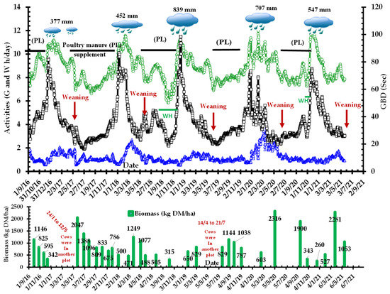 Figure 5) showed significantly low biomass. In addition, the biomass of forage in the farm herds was too low, and the farmers began giving them WH as a supplement on 3 July 2018. The average GBD of the cows from 26 June to 2 July 2018 was 17 s, and daily grazing time was 8.3 h. Based on this information, we decided to delay the provision of this expensive roughage supplement to the herd. From 27 August to 1 September 2018, the average GBS was 36 s and the daily grazing time was 8.0 h. Based on this GBD value, we initiated the WH supplement on 3 September 2018 (