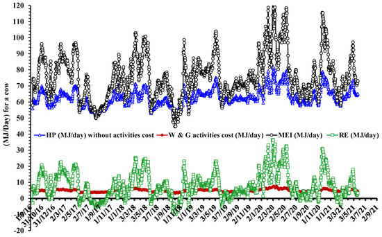 5]. This enables the estimation of the total EB of free-range grazing animals (MEI−HP−activity (walking and grazing) energy costs = recovered energy (RE)). The RE (MJ/day) represents the energy retained in the body plus milk energy.